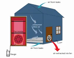 - Il consiste à installer un ventilateur dans l’encadrement d’une porte pour créer une différence de pression entre l’intérieur et l’extérieur.